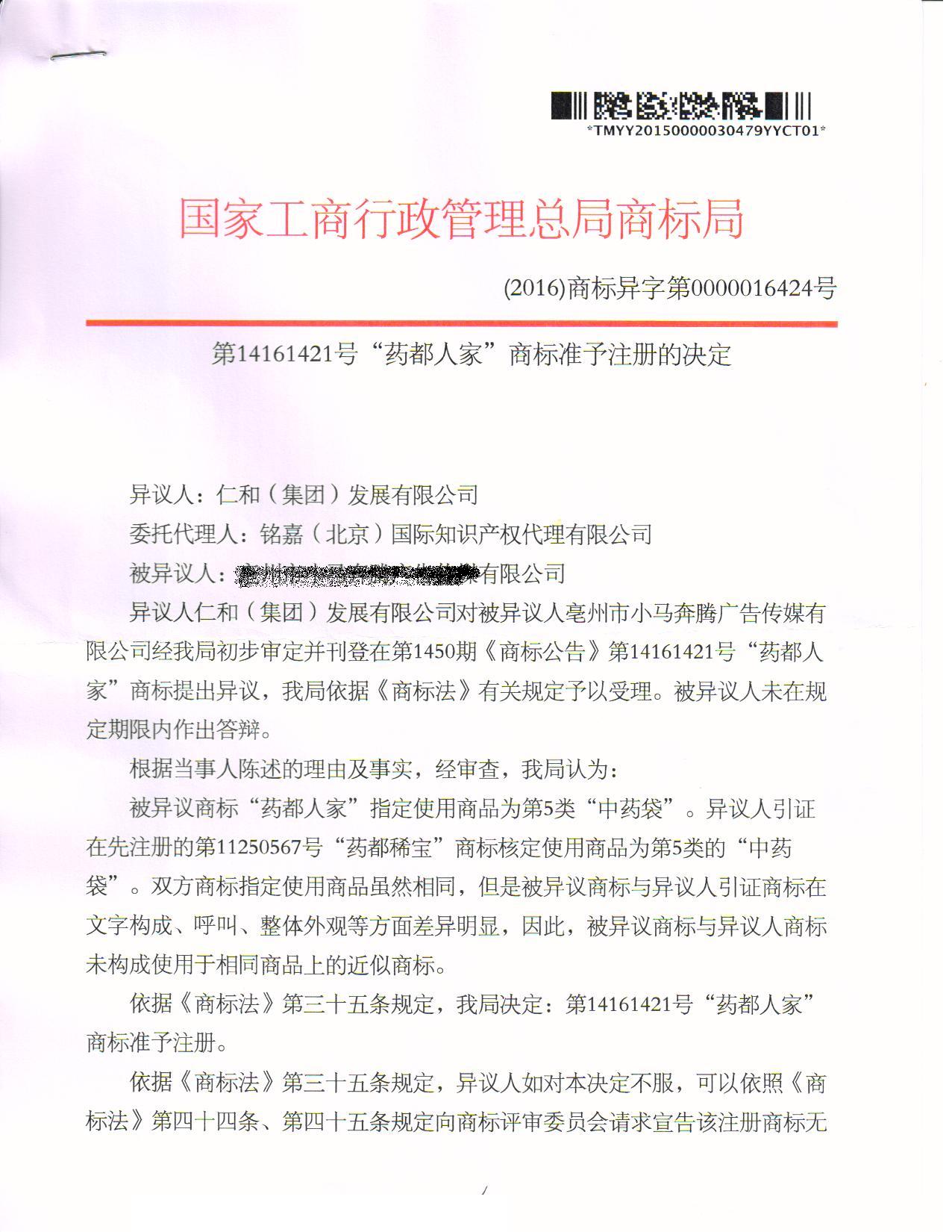 商标准予注册的决定——异议