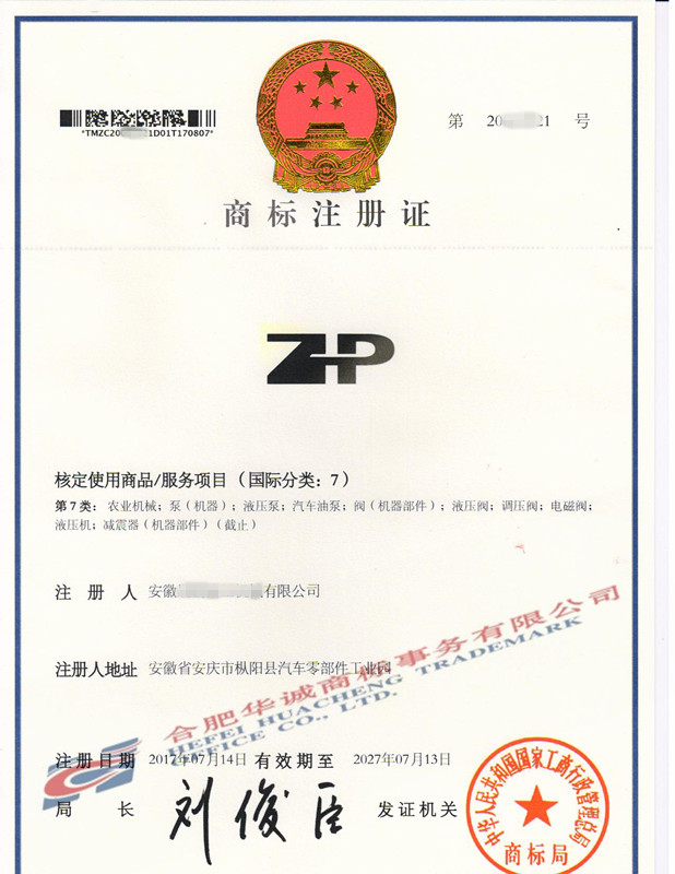 您委托我所代理商标注册申请,名称为“ZP”7类商标注册证已下达。
