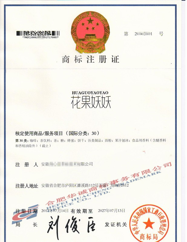 您委托我所代理商标注册申请,名称为“花果妖妖”30类商标注册证已下达。