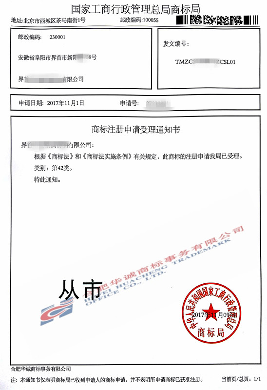 您委托我所代理商标注册申请,名称为“从市”9、35、38、42、45类商标已被国家商标局受理。