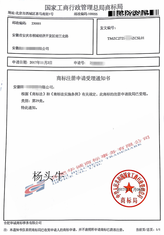 您委托我所代理商标注册申请,名称为“杨头牛”29类商标已被国家商标局受理。