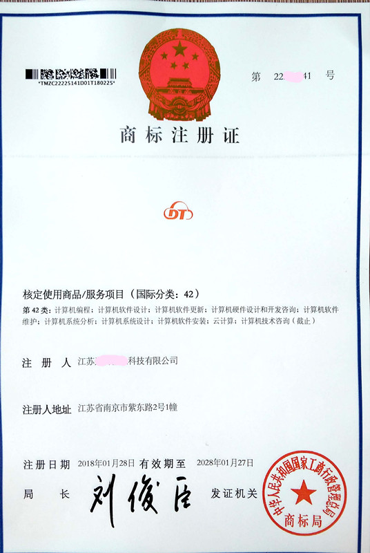 您委托我所代理商标注册申请,名称为“DT” 42类商标注册证已下达。