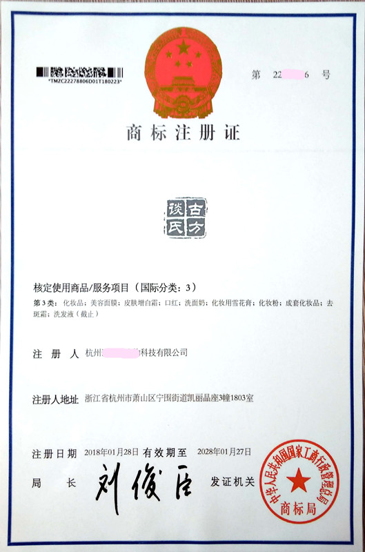 “谈氏古方” 3类商标注册证下达