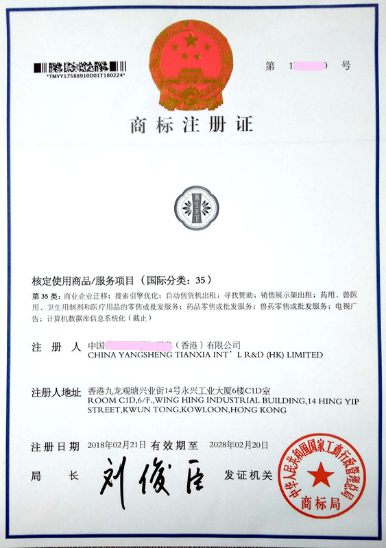 您委托我所代理商标注册申请,名称为“养生天下” 35类商标注册证已下达。