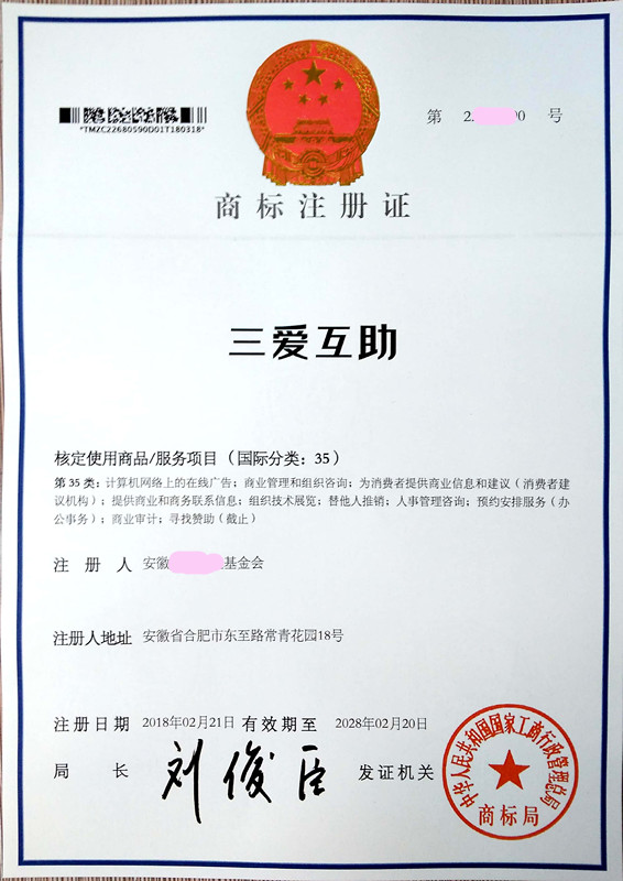 您委托我所代理商标注册申请,名称为“三爱互助”35类、36类商标注册证已下达。