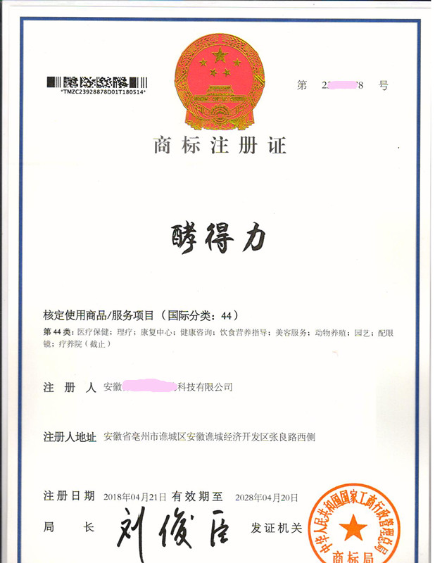 “酵得力”44类商标注册证下达