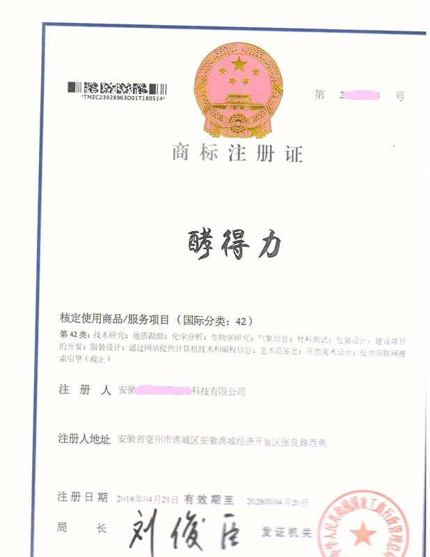 “酵得力”42类商标注册证下达