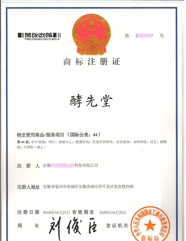 “酵先堂”44类商标注册证下达