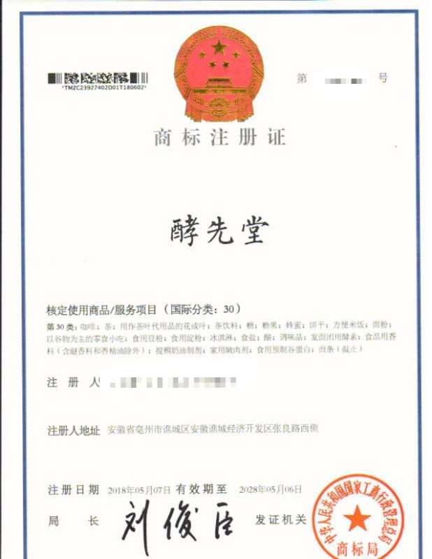 “酵先堂”30类商标注册证下达