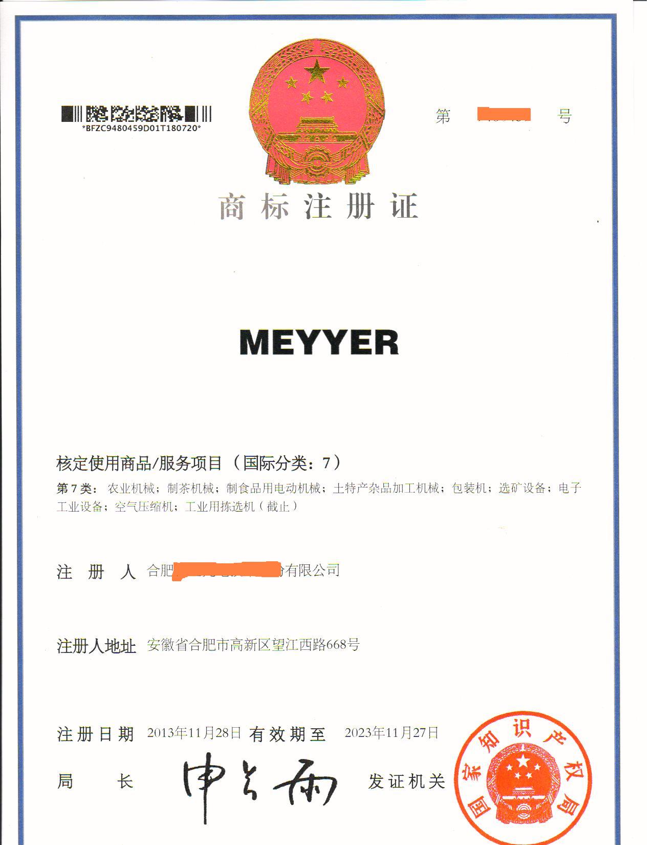“MEYYER”7类商标注册证下达